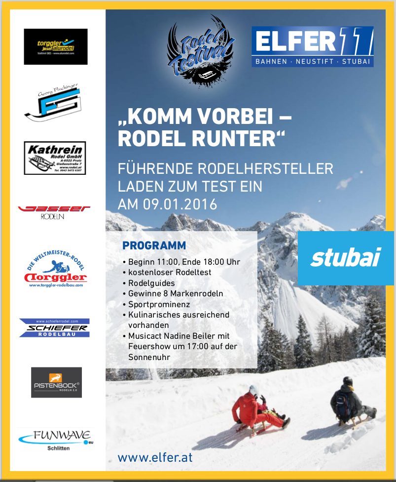 - 8 Rodelhersteller werden ihre Produkte präsentieren. Der Clou dabei: man kann sich seine Favoriten-Rodel ausleihen und sie auf der Rodelbahn vom Elfer nach Neustift ausgiebig testen