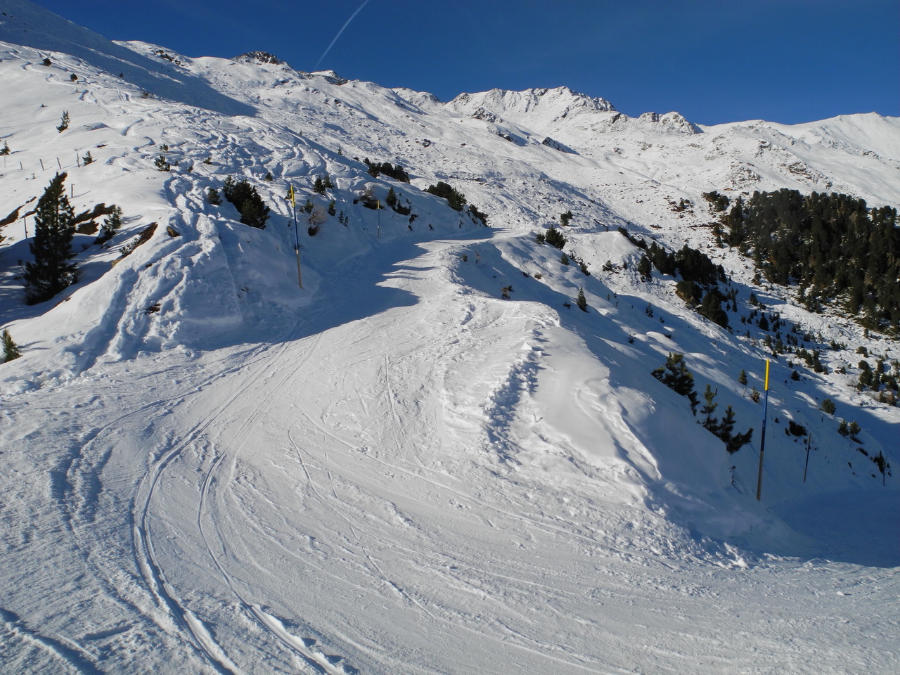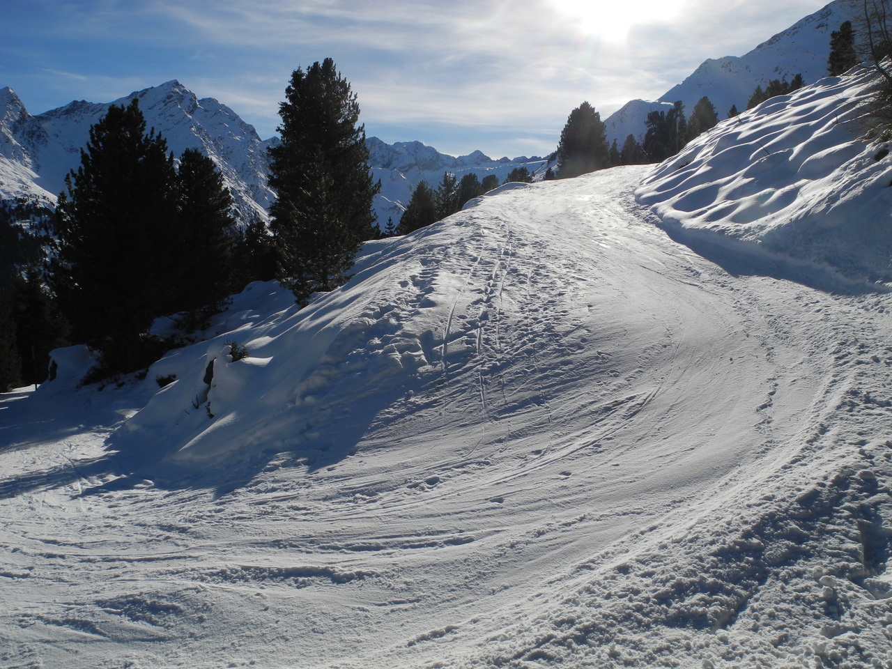 Nach der Flachstelle kommt man in den oberen, steileren Abschnitt der Rodelbahn. Die Strecke führt nun in zwie langen Schleifen quer über die Hänge der Lampsenspitze Richtung Koglhütte. Zu dieser Jahreszeit liegt der gesamte obere Abschnitt der Strecke am späten Vormittag in der Sonne