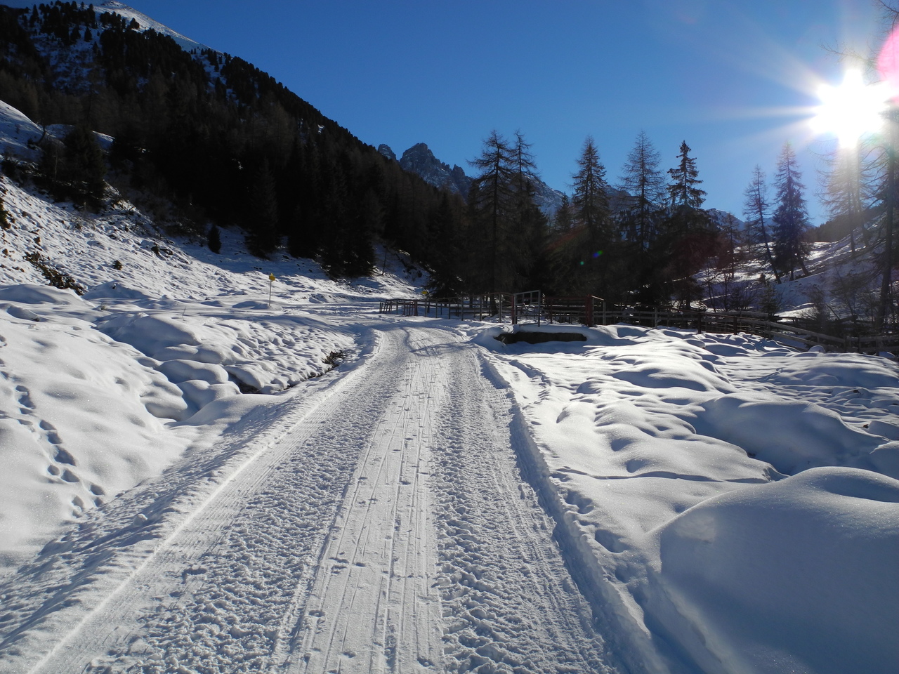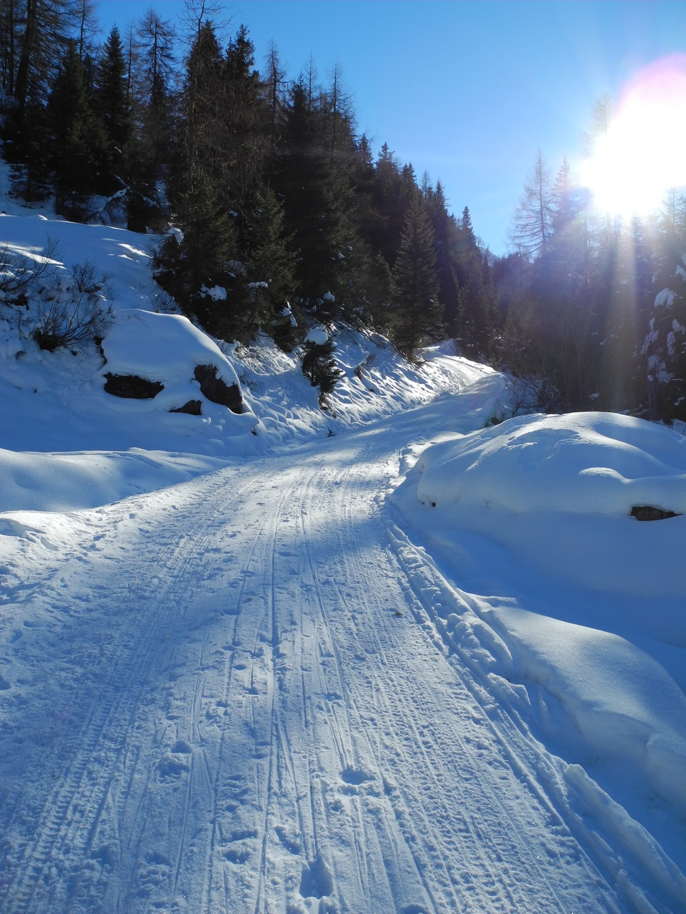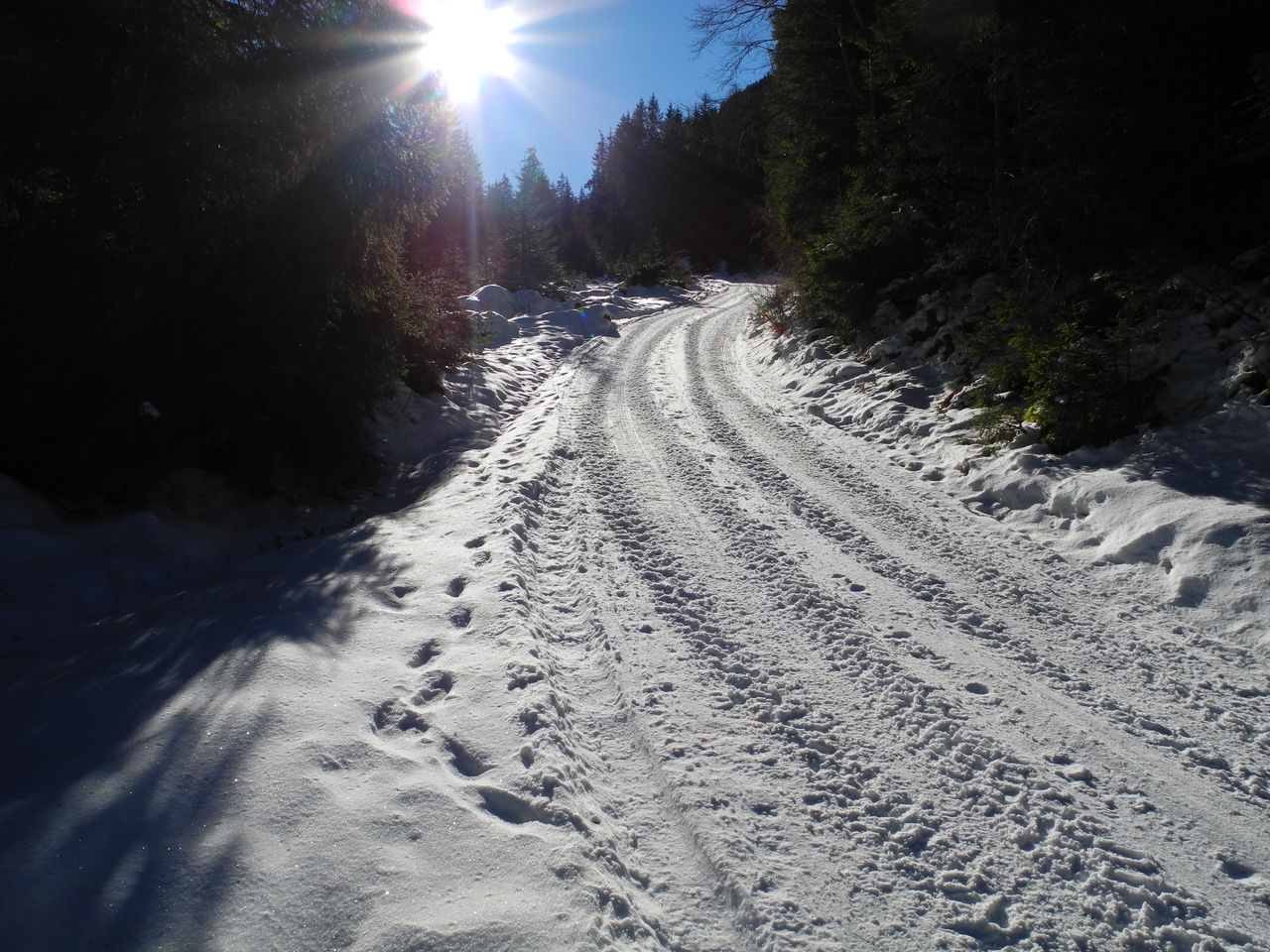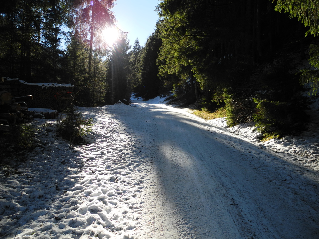 Der unterste, flache Abschnitt bis zum eigentlichen Beginn der Rodelbahn ist großteils aper und man muss die Rodel tragen; am Ende des aspahltierten Straßenabschnittes beginnt aber auch der Schnee. Die Rodelbahn ist durchgängig mit einer kompakten, festen Schneeauflage bedeckt; es gibt praktisch kein Eis und nur sehr selten ein paar Steinchen in der Bahn. Gleiches gilt für größere Mugel - es fehlt einfach der Schnee. Bei einem Aufstieg um die Mittagszeit gibt es auch um diese Jahreszeit immer wieder sonnige Abschnitte; zudem war es heute auch nicht besonders kalt