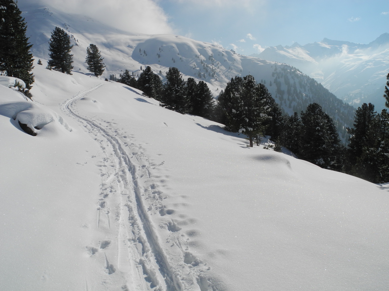 Erfreulicher Weise war die Bahn erst am Vorabend noch einmal präpariert worden und somit beim Aufstieg am späteren Vormittag in einem guten Zustand; ein harter Untergrund mit einer weichen Neuschneeauflage.