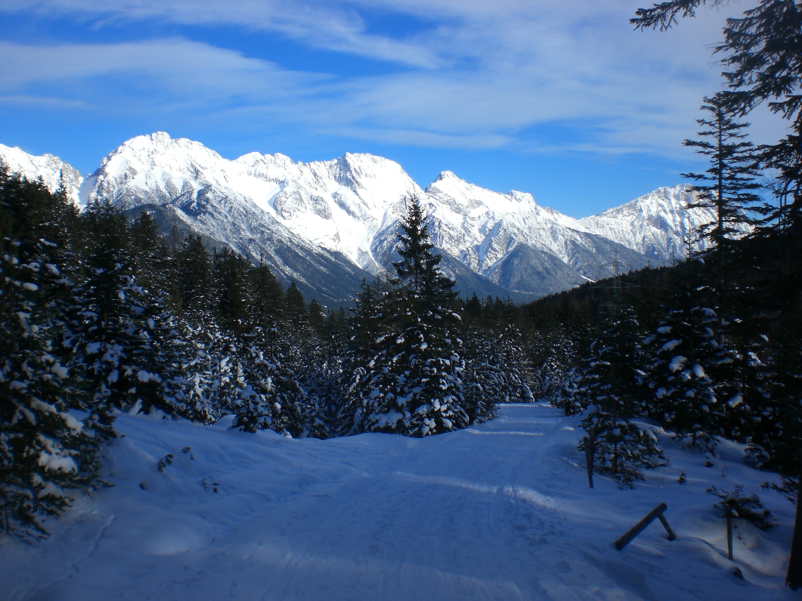 Auch der Aufstieg durch den Wald zum Zwischensimmering erfolgte heute auf perfekter Schneebahn ohne Eis; bei der oberen Schipistenquerung eröffnete sich ein schöner Blick zurück nach Obsteig: