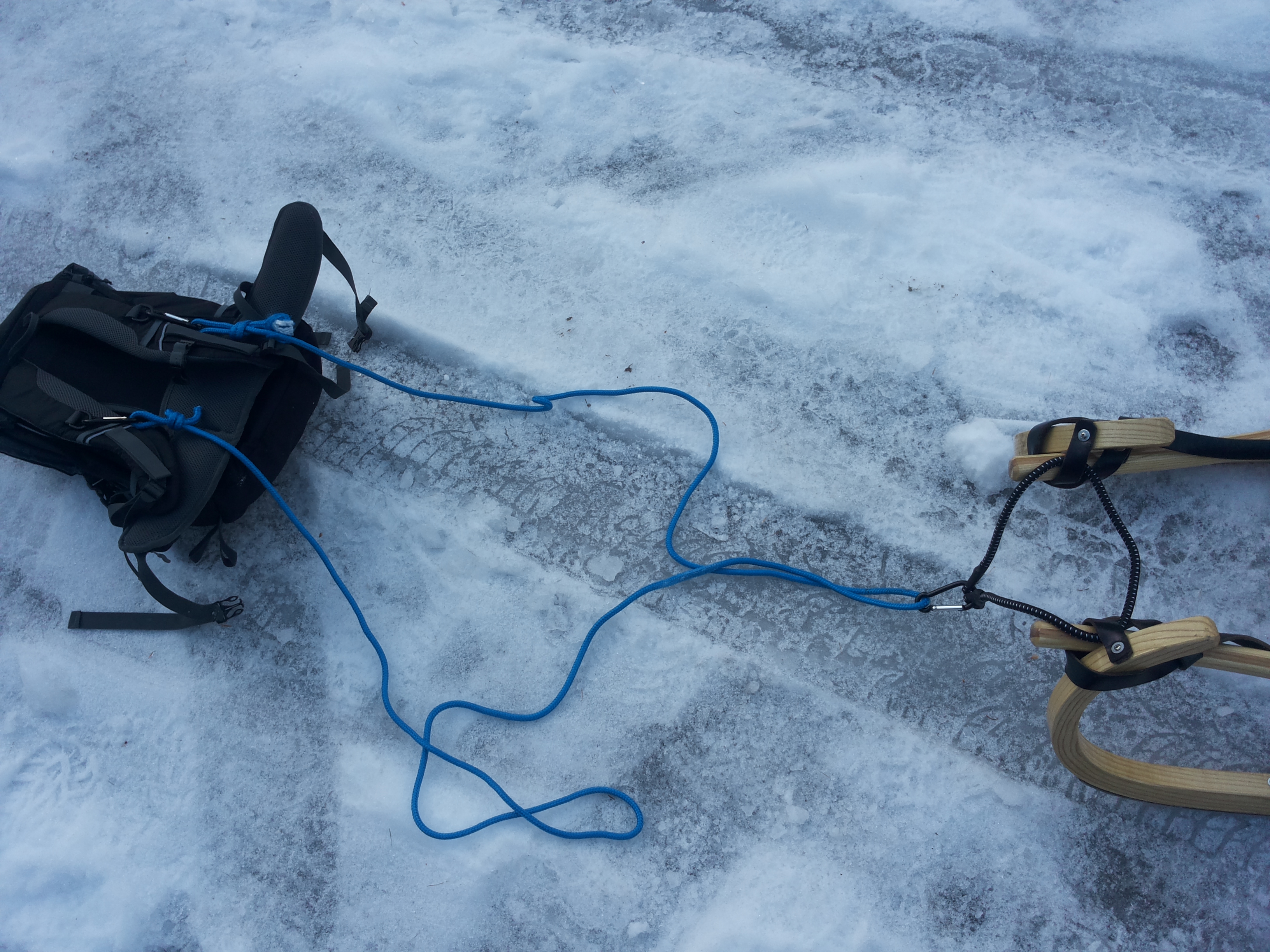 Auf alle Fälle befestige ich die Wanderstöcke bei der Abfahrt mit dem gleichen Geschirr dass ich für den Aufstieg verwende. Bei einem Planensitz der seitlich nur auf die Rodel geschnürrt ist,bietet sich viel Spielraum um das Seil um die Stecken zu wickeln und mit Karabiner zu fixieren. oioi