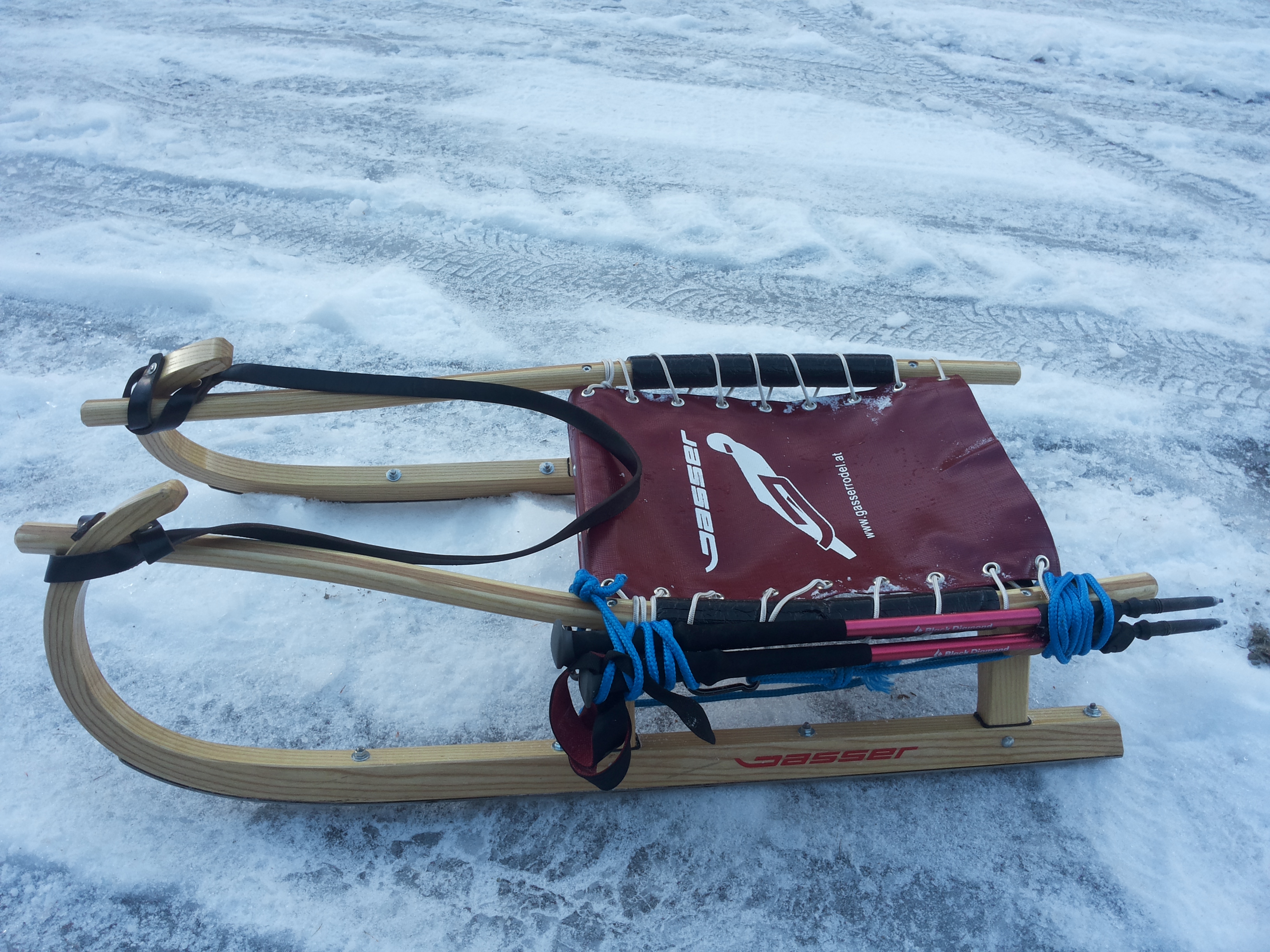mit dem Baumarktseil und den Karabiner wickel ich die Stöckel einfach an die Rodel. Mal ordentlich und mal weniger :lol: