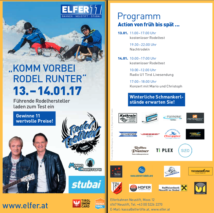 Auch heuer stehen natürlich wieder die Rodelhersteller mit ihren Produkten im Mittelpunkt der Veranstaltung: Man kann sich über neue Innovationen informieren, die verschiedenen Rodelmodelle vergleichen und sich die Eigenschaften erklären lassen um seine Lieblingsrodel zu finden. Das Beste ist aber die Möglichkeit, sich diese Rodel auch ausleihen zu können und gleich vor Ort eine Testfahrt auf der Rodelbahn Elfer-Neustift Dorf zu absolvieren. Wo sonst hat man die Gelegenheit Rodeln so praxisnah zu testen?